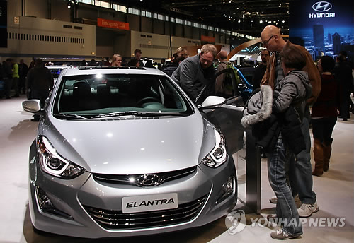 | △ 미국 자동차 소비자들이 지난 2월 개막한 시카고 오토쇼 현대차 전시실에서 엘란트라(아반떼)를 살펴보고 있다. (연합뉴스 자료사진) |