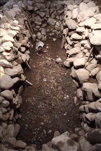 조사단은 아래쪽 인골이 하늘을 바라보며 똑바로 누운 상태임을 고려해 이 사람을 무덤 주인공으로 보았다.