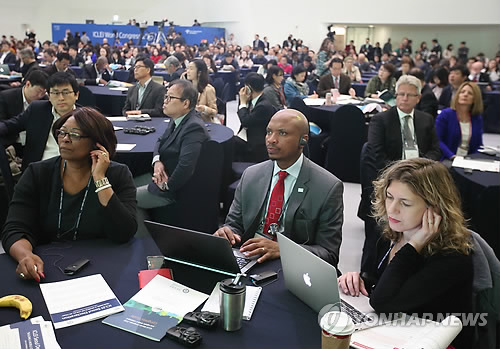 | △ 경청 (서울=연합뉴스) 한종찬 기자 = 9일 오후 동대문디자인플라자(DDP)에서 열린 이클레이(ICLEI) 세계도시 기후환경 개막총회에서 참가자들이 박원순 서울시장의 인사말을 듣고 있다. |