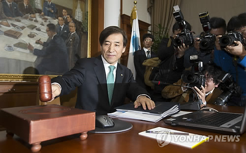 | △ 의사봉 두드리는 이주열 총재 (서울=연합뉴스) 윤동진 기자 = 이주열 한국은행 총재가 9일 오전 서울 중구 한국은행에서 열린 금융통화위원회 회의에서 의사봉을 두드리고 있다. |