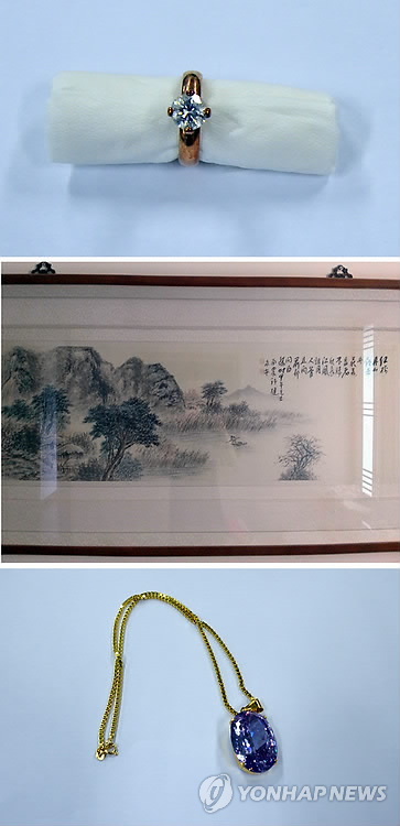 | △ 고액체납자로부터 압류한 귀금속 및 미술품 (세종=연합뉴스) 국세청이 2014년 한 해 동안 고액·상습체납자에 대한 재산추적조사를 통해 총 1조4천28억원의 체납 세금을 징수하거나 확보했다고 밝혔다. 사진은 호화 생활을 하던 중견기업 전 회장으로 부터 압류한 1캐럿 다이아반지(위로 부터), 남농 허건의 작품 산수화, 5돈 짜리 자수정 금목걸이. (국세청 제공) |