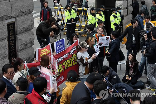 | △ '성매매 특별법 폐지 촉구' (서울=연합뉴스) 박동주 기자 = 헌법재판소의 '성매매알선 등 행위의 처벌에 관한 법률(성매매 특별법)' 공개변론을 앞두고 한터전국연합·한터여종사자연맹 관계자들이 9일 오후 서울 헌법재판소에서 앞에서 성매매특별법 폐지를 촉구하고 있다. |