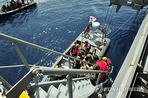| △ 예멘 체류 한국인 6명 왕건함에 올라 오만行 (서울=연합뉴스) 시아파 반군에 대한 공습으로 치안이 불안해진 예멘에 있던 우리 국민 6명이 9일(한국시간) 오만으로 철수하기 위해 청해부대 왕건함에 오르고 있다. (국방부 제공) |