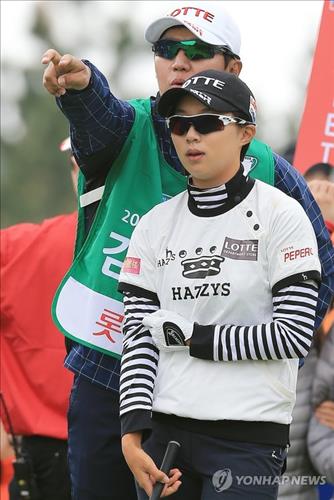| △ (제주=연합뉴스) 김호천 기자 = 지난 시즌 KLPGA 투어 상금왕인 김효주(20·롯데)가 9일 롯데스카이힐 제주컨트리클럽에서 열린 제8회 롯데마트 여자오픈 1라운드 경기 2번 홀에서 티샷을 하기 전 캐디와 이야기하고 있다. 2015.4.9 |