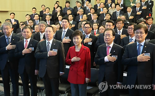 | △ 경남창조경제혁신센터 출범식 (창원=연합뉴스) 도광환 기자 = 박근혜 대통령이 9일 오전 경남창원과학기술진흥원에서 열린 경남창조경제혁신센터 출범식에 참석, 박용만 두산그룹회장, 홍준표 경남도지사 등과 함께 국가에 대한 경례를 하고 있다. 2015.4.9 dohh@yna.co.kr |