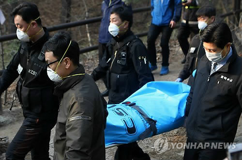 | △ 숨진 채 발견된 성완종 회장 (서울=연합뉴스) 박영서 기자 = 9일 오후 북한산 형제봉 매표소 인근에서 숨진 채 발견된 성완종 전 경남기업 회장의 시신을 경찰 관계자들이 옮기고 있다. 성 전 회장은 자원외교 비리 의혹에 연루돼 사전 구속영장이 청구된 상태였다. |