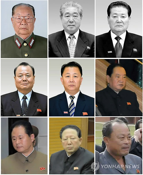 | △ 두 번째 줄 왼쪽이 박도춘 최고인민회의 대의원이다. 사진은 지난해 7월 연합뉴스가 북한 군수공업 분야의 1세대인 전병호 전 노동당 군수담당 비서의 사망을 계기로 이 분야의 세대교체를 정리한 것이다. 사진 맨 위의 줄은 군수분야의 일선에서 물러난 인물들로 왼쪽부터 전병호, 주규창 전 노동당 기계공업부(과거 군수공업부) 부장, 백세봉 전 2경제(군수경제)위원회 위원장. 두 번째와 세 번째 줄은 최근 군수공업 분야의 떠오르는 실세들로 두 번째 줄 왼쪽부터 박도춘 당 군수담당 비서, 조춘룡 2경제위원장, 강관일 당 기계공업부 부부장, 세 번째 줄 왼쪽부터 홍영칠·홍승무 당 기계공업부 부부장, 최춘식 제2자연과학원장. <<연합뉴스DB>> |