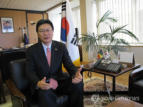 | △ 김창범 주 유럽연합(EU).벨기에 대사 (브뤼셀=연합뉴스) 송병승 특파원 = 김창범 주 유럽연합(EU) 벨기에 대사가 9일 집무실에서 연합뉴스와 인터뷰하고 있다. 2015.4.9 photo@yna.co.kr |
