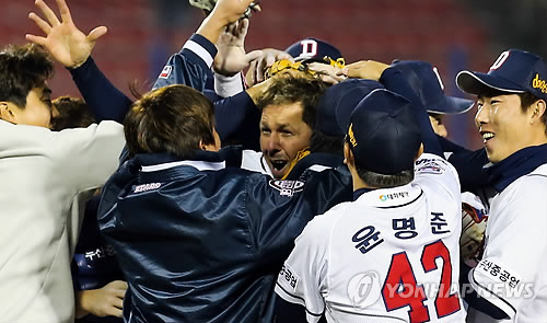 | △ 동료 축하 받는 노히트 노런의 주인공 마야 (서울=연합뉴스) 지난해 7월 대체 선수로 한국땅을 밟은 프로야구 두산 유니에스키 마야가 9일 서울 잠실야구장에서 열린 넥센과 경기에서 노히트 노런을 기록한 후 팀동료와 환호하고 있다. 마야는 9이닝 동안 단 한 개의 안타도 내주지 않고 볼넷 3개로 무실점 하는 완벽한 투구를 펼쳐 노히트 노런의 주인공이 됐다. 2015.4.9 << 두산베어스 제공 >> jjaeck9@yna.co.kr |