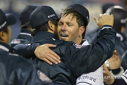 | △ 노히트 노런의 주인공 마야 (서울=연합뉴스) 지난해 7월 대체 선수로 한국땅을 밟은 프로야구 두산 유니에스키 마야가 9일 서울 잠실야구장에서 열린 넥센과 경기에서 노히트 노런을 기록한 후 환호하고 있다. 마야는 9이닝 동안 단 한 개의 안타도 내주지 않고 볼넷 3개로 무실점 하는 완벽한 투구를 펼쳐 노히트 노런의 주인공이 됐다. 2015.4.9 << 두산베어스 제공 >> jjaeck9@yna.co.kr |