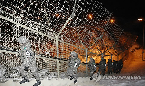 | △ 강원 철원군 중부전선에서 육군 6사단 병사들이 철책을 점검하며 경계근무를 하고 있다.(연합뉴스 자료사진) |