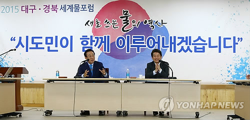 | △ '대구·경북이 이루어내겠습니다' (대구=연합뉴스) 김준범 기자 = 9일 오전 대구시청 10층 대회의실에서 열린 '세계물포럼 담화문 공동발표'에서 김관용 경북도지사와 권영진 대구시장이 물포럼 성공 개최를 다짐하며 시민들의 참여를 호소하는 담화물을 발표하고 있다. |