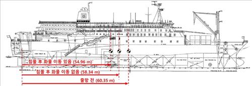 세월호의 출항 당시 무게 중심은 선미로부터 60.35m였지만 좌측면이 바닥에 닿게 침몰하면서 화물이 움직이지 않았다면 58.34m, 화물이 이동했다면 54.96m로 추정된다.