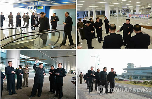 | △ 북한 김정은 '완공단계' 평양공항 시찰 (서울=연합뉴스) 북한 김정은 국방위원회 제1위원장이 완공단계에 이른 평양 순안국제공항 2청사 공사 현장을 현지지도했다고 노동신문이 12일 전했다. 수행원들과 현장을 둘러보는 김정은. 2015.4.12 nkphoto@yna.co.kr |
