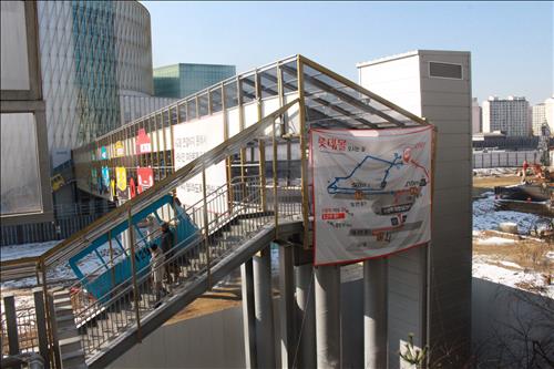 하지만 수원시의 버스환승센터 완공 일정이 2016년말로 연기되면서 대체 수단으로 지난해 6월부터 보행 육교를 짓기 시작했다. 버스환승센터가 완성될 때까지 사람들이 수원역사 2층과 몰 2층을 오가도록 통행로를 확보할 필요가 있었다.
