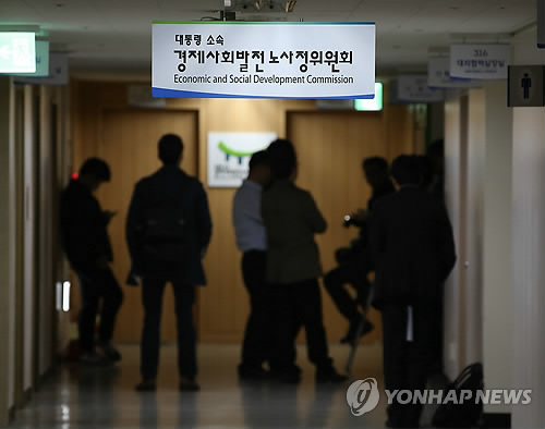 | △ 지난 9일 서울 세종로 정부서울청사에서 열린 제17차 노동시장구조개선특위 회의장 입구에서 취재진이 대기하고 있다. (연합뉴스 자료사진) |