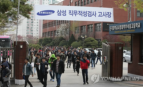 | △ 삼성직무적성검사 마친 수험생들 (서울=연합뉴스) 임헌정 기자 = 12일 서울 강남구 대치동 단국대부속고등학교에서 열린 삼성직무적성검사(SSAT)를 마친 수험생들이 고사장을 나서고 있다. 2015.4.12 kane@yna.co.kr |