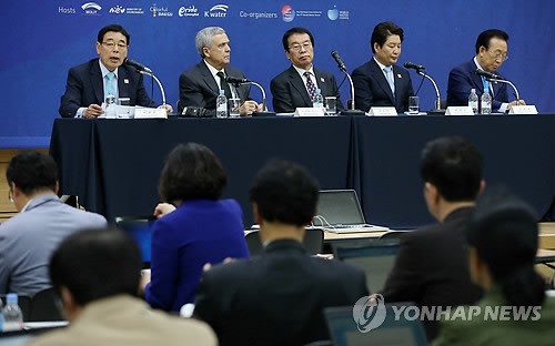 세계물포럼 개막일인 12일 오후 대구 엑스코(EXCO) 프레스센터에서 열린 조직위원회 기자회견에 나선 패널들은 "제7차 세계물포럼 핵심은 해결 방안 실행에 있다"고 강조했다.