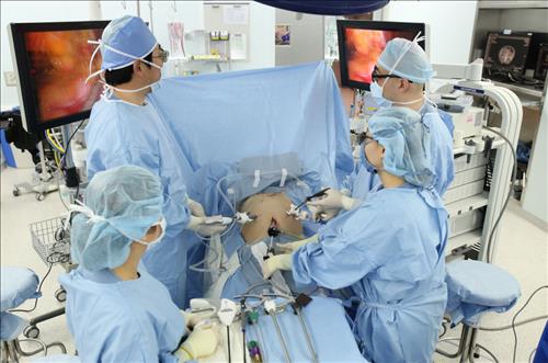 | △ 분당서울대병원 외과 한호성 교수와 존스홉킨스병원 진헤(Jin He)교수가 '복강경 췌장절제술'을 집도하고 있다. |