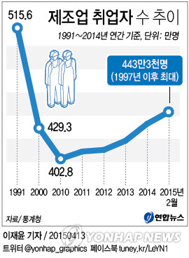 산업분류 체계가 다소 바뀌어 정확한 비교는 어렵지만 2003년 이전의 제조업 취업자 통계까지 따져보면 외환위기 초입인 1997년 12월(447만7천 명) 이후 최대치다.