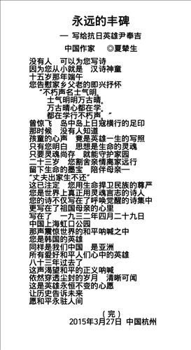 '영원한 기념비- 항일 영웅 윤봉길 의사에 바치는 시'(永遠的豊碑- 寫給抗日英雄尹奉吉)라는 제목의 이 시에서 작가는 윤봉길 의사가 어린 시절부터 보여줬던 기개와 그 마음이 훗날 의거로 이어지는 과정을 운명으로 묘사했다.