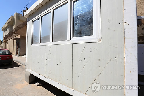 | △ 총알 자국 선명한 경비초소 (트리폴리<리비아> EPA=연합뉴스) 리비아 수도 트리폴리에 있는 한국 대사관이 12일(현지시간) 수니파 무장조직 이슬람국가(IS) 연계 무장 괴한 세력의 기습 공격을 받아 대사관 경비원 2명이 숨지고 1명이 다쳤다. 대사관에서 근무하던 외교관 2명과 행정원 1명 등 한국인의 피해는 없는 것으로 확인됐다. 사진은 총알 자국이 선명한 대사관 밖 경비초소의 모습. 2010596@yna.co.kr |