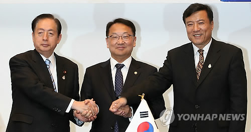 | △ 제2차 한·일·중 수자원 장관회의 (경주=연합뉴스) 한종찬 기자 = 13일 오후 경주 현대호텔에서 열린 2015 대구·경북 세계물포럼 '제2차 한·일·중 수자원 장관회의'에서 오타 아키히로 국토교통장관(왼쪽부터), 유일호 국토교통부 장관, 자오 융 중국 수리부 부부장이 손을 맞잡고 포즈를 취하고 있다. 2015.4.13 saba@yna.co.kr |