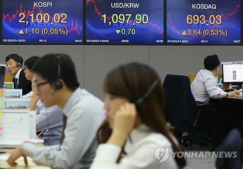| △ 코스피, 장중 2,100선 돌파…코스닥도 690선 넘어서 (서울=연합뉴스) 김도훈 기자 = 코스피가 장중 2,100선을 넘어선 14일 오전 서울 중구 외환은행 본점 딜링룸에서 직원들이 업무를 보고 있다. 코스피가 2,100선을 넘어선 것은 지난 2008년 8월 2일 장중 고점 2,155.44를 기록한 이후 처음이다. 한편 이날 코스닥도 장중 690선을 넘어섰다. 코스닥 지수가 690선을 넘은 것은 2008년 1월 15일 장중 고점 696.11을 나타낸 이후 처음이다. 종가 기준으로는 2008년 1월 11일(699.24)이 마지막이다. 2015.4.14 superdoo82@yna.co.kr |