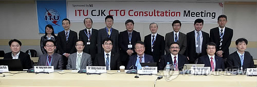 | △ ITU 한중일 CTO 자문 회의 (서울=연합뉴스) 14일 서울 서초구 KT 우면동 연구개발센터에서 열린 'ITU 한중일 CTO 자문회의'에서 KT 이동면 융합기술원장이 참석자들과 기념촬영을 하고 있다. 2015.4.14 << KT 제공 >> photo@yna.co.kr |