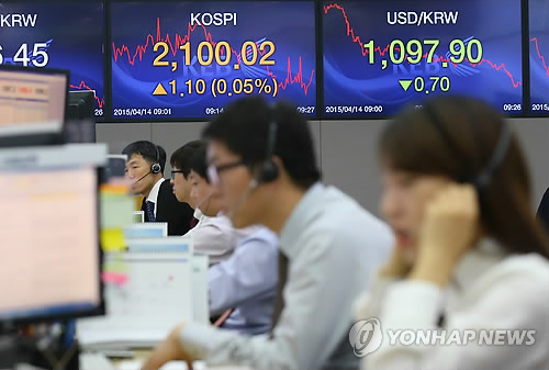 | △ 코스피, 장중 2,100선 돌파 (서울=연합뉴스) 김도훈 기자 = 코스피가 장중 2,100선을 넘어선 14일 오전 서울 중구 외환은행 본점 딜링룸에서 직원들이 업무를 보고 있다. 코스피가 2,100선을 넘어선 것은 지난 2008년 8월 2일 장중 고점 2,155.44를 기록한 이후 처음이다. |