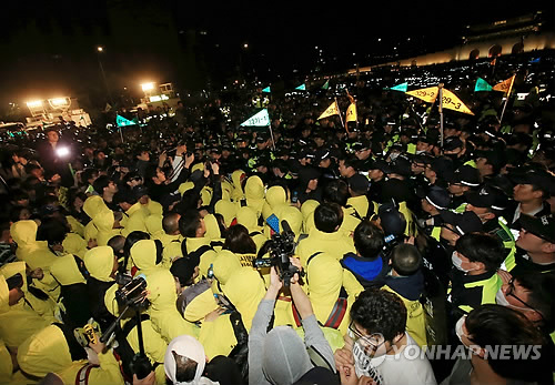 | △ 지난 11일 저녁 서울 광화문광장에서 세월호 선체 인양과 세월호 특별법 시행령 폐지를 촉구하는 문화제에 참석한 참가자들이 차단벽 앞에서 경찰과 대치하고 있다. |