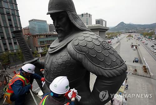 (서울=연합뉴스) 이정현 기자 = 박원순 서울시장은 충무공 이순신 장군 탄신 470주년(28일)을 앞둔 14일 오전 광화문광장에서 이순신 장군 동상의 묵은 때를 씻어내는 친수식에 참여했다.
