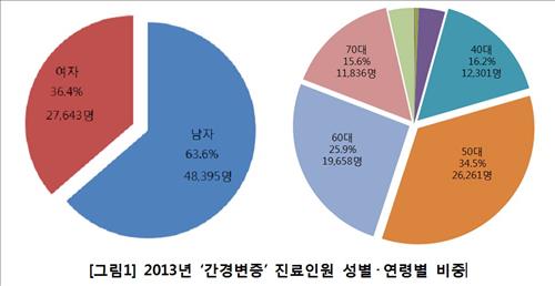 15일 건강보험공단의 건강보험 진료비 지급자료 분석 결과에 따르면 2013년 강경변증(질병코드 K74) 환자는 7만6천38명으로 4년 전인 2009년의 6만9천933명보다 8.7% 늘었다.