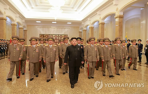 | △ 북한 김정은, 김일성 생일 맞아 금수산태양궁전 참배 (서울=연합뉴스) 북한 김정은 국방위원회 제1위원장이 할아버지 김일성 주석의 103회 생일(태양절)인 15일 군 간부들을 대동하고 김일성·김정일의 시신이 안치된 금수산태양궁전을 참배했다고 노동신문이 보도했다. 황병서 군 총정치국장, 리영길 군 총참모장, 김원홍 국가안전보위부장, 김춘삼 작전국장, 박영식 총정치국 조직부국장, 조경철 군 보위사령관이 수행했다. 2015.4.15 nkphoto@yna.co.kr |