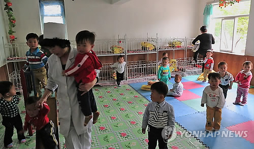 | △ 세계식량계획(WFP)의 지원을 받는 북한 평안남도 평성시의 한 탁아소 내 침실 모습으로 지난해 5월 WFP 어서린 커즌 사무총장의 방북 당시 촬영된 사진이다. <<연합뉴스DB>> |