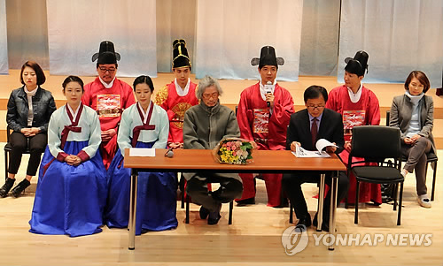 | △ 연극 '연악' 제작발표회 (영동=연합뉴스) 박병기 기자 = 우리나라 3대 악성 중 한명인 난계 박연(朴堧·1378∼1458)의 음악생애를 그린 연극 '연악'이 제작된다. 극단 도화원이 지난 13일 충북 영동에서 출연진과 함께 제작발표회를 열고 있다. 2015.4.15 <<극단 도화원 제공>> bgipark@yna.co.kr |