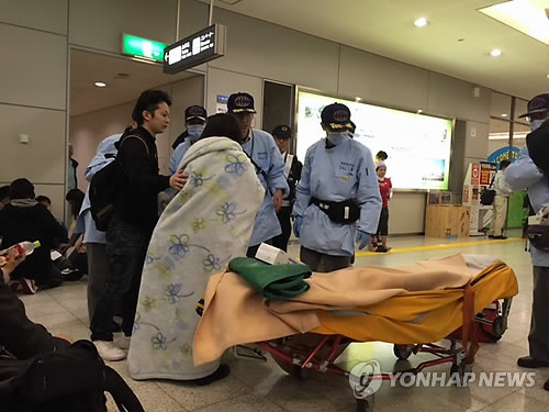 | △ 병원 이송되는 탑승객들 (서울=연합뉴스) 아시아나항공 여객기가 일본 히로시마 공항에 착륙하면서 활주로를 벗어나는 사고가 발생한 14일 일본 구급대원들이 승객들을 병원으로 옮기고 있다. (독자 제공) |