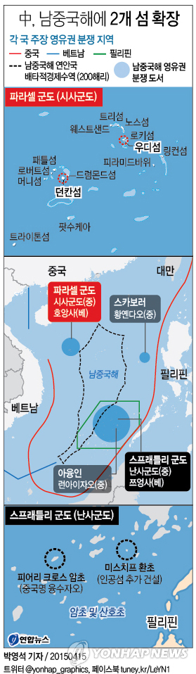 (서울=연합뉴스) 정주호 기자 = 중국이 남중국해 분쟁도서인 파라셀 군도(중 국명 시사<西沙>군도) 부근에도 두개의 섬을 확장중인 것으로 나타났다.