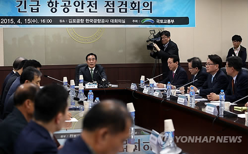 | △ 아시아나 착륙사고 관련 항공안전 점검회의 (서울=연합뉴스) 신준희 기자 = 15일 오후 서울 김포공항 한국공항공사에서 여형구 국토부 제2차관 주재로 긴급 항공안전 점검회의가 열리고 있다. 이날 회의에는 김수천 아시아나항공 사장과 대한항공 지창훈 사장 등 8개 항공사 대표와 항공기사용사업체 대표, 공항공사 사장 등이 참석했다. 지난 14일 오후 인천을 출발한 아시아나항공 여객기가 일본 히로시마공항에 착륙 도중 활주로를 이탈하는 사고가 발생해 10여명이 경상을 입었다. 2015.4.15 hama@yna.co.kr |