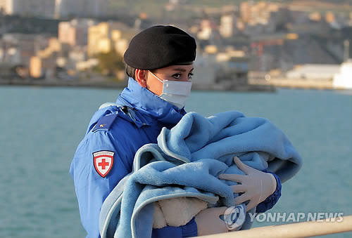 | △ 엄마는 어디가고… (시칠리아 AP=연합뉴스) 리비아를 떠나 이탈리아로 가던 난민 약 400명이 지중해 해상에서 전복사고로 익사했다고 국제아동구호단체 세이브더칠드런과 국제이주기구(IOM) 등이 14일(현지시간) 밝혔다. 생존자들은 난민 550명 정도가 타고 있던 선박이 지난 12일 지중해에서 뒤집혀 144명만 이탈리아 해안경비대에 의해 구조됐다고 전했다. 사진은 적십자사 요원이 13일 난민 구조선이 시칠리아의 포르토 엠페도클레 항에 도착한 후 한 아기를 담요에 싸서 옮기고 있는 모습. marshal@yna.co.kr (AP Photo/Calogero Montanalampo) |