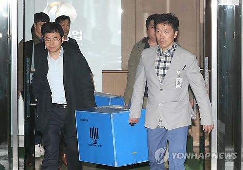 | △ 경남기업 본사 압수수색 마친 검찰 (서울=연합뉴스) 홍해인 기자 = 성완종 전 경남기업 회장의 정치권 금품제공 의혹을 수사 중인 검찰 특별수사팀 관계자들이 15일 저녁 서울 동대문구 답십리동 경남기업 본사에서 압수수색을 마친 뒤 압수물이 든 상자를 옮기고 있다. |
