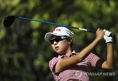| △ 세월호 1주년, 노란 리본 달고 경기하는 김효주 (서울=연합뉴스) 세월호 참사가 일어난 지 1년이 된 16일 스포츠계에서도 희생자들을 추모하는 물결이 이어졌다. 16일 하와이 호놀룰루 오아후 코올리나 골프클럽에서 열린 롯데챔피언십에 참가한 김효주(롯데)가 모자에 노란 리본을 달고 경기에 임하고 있다. 14번홀 티샷을 하는 모습. 2015.4.16 << LOTTE 제공>> photo@yna.co.kr |