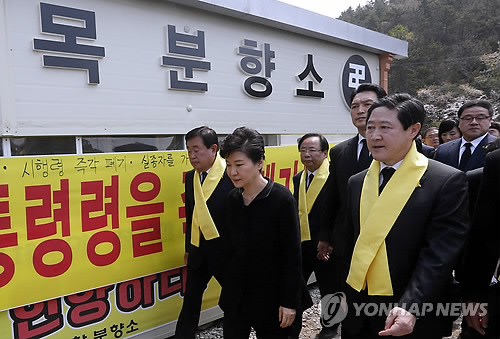 (진도=연합뉴스) 박철홍 기자 = 박근혜 대통령이 세월호 1주년인 16일 희생자 추모와 유가족 위로를 위해 전남 진도군 팽목항을 방문했다.