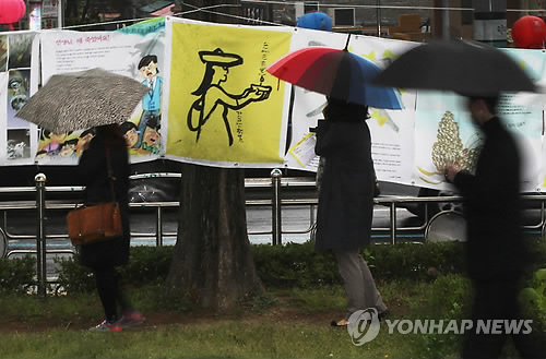 | △ 빗속 세월호 추모 (대전=연합뉴스) 이재림 기자 = 비가 내리는 16일 오후 대전 중구 서대전시민공원에서 시민들이 세월호 참사 1주년 합동분향소 인근에 걸린 추모글과 그림을 살펴보고 있다. |