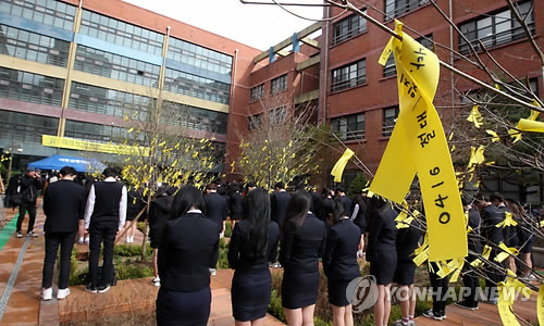 | △ "선배의 희생정신 잊지 않겠습니다" (시흥=연합뉴스) 최종호 기자 = 세월호 참사 1주년인 16일 침몰하는 세월호에서 승객 탈출을 돕다가 숨진 승무원 박지영(22·여)씨를 기리는 추모식이 그의 모교인 경기 시흥고등학교에서 열리고 있다. 2015.4.16 zorba@yna.co.kr |