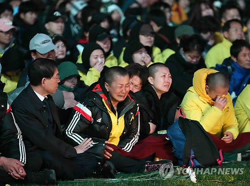 | △ 세월이 흘러도 (서울=연합뉴스) 서명곤 기자 = 세월호참사 1주기인 16일 오후 서울광장에서 세월호 참사 국민대책회의 주최로 열린 '세월호 추모문화제'에서 희생자 가족들이 눈물을 흘리고 있다. |