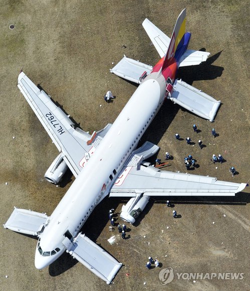 | △ (히로시마 교도=연합뉴스) 일본 히로시마(廣島)공항에 착륙하다 활주로를 벗어난 아시아나항공 여객기(162편, A320기)기 주변에서 15일 현장 조사가 이뤄지고 있다. 이 항공기는 전날 발생한 사고로 왼쪽 엔진 덮개가 벗겨지고 보조 날개와 수평 꼬리날개가 파손되는 등 곳곳이 손상된 상태다. |