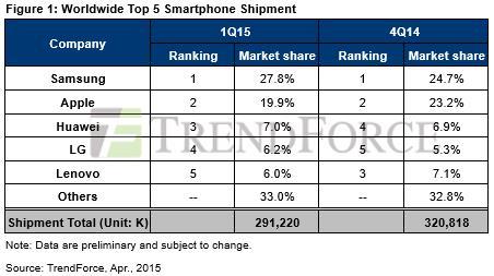 17일 디램익스체인지의 트렌드포스 보고서에 따르면 2015년 1분기 스마트폰 시장 점유율 순위는 삼성전자(27.8%), 애플(19.9%), 화웨이(7.0%), LG[003550](6.2%), 레노버(6.0%) 순으로 파악됐다.