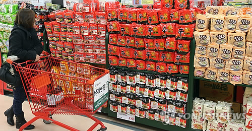 | △ 17일 관세청이 발표한 '최근 5년간 면류 수출입 동향'에 따르면 작년도 라면 수출액은 2억800만 달러로 전년(2억1천300만 달러)에 비해 1.9% 줄었다. 사진은 서울시내 한 대형마트 라면 코너. (연합뉴스 자료사진) |