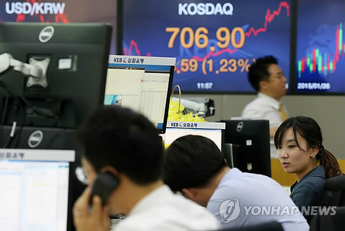 | △ 7년 3개월만 700선 돌파한 코스닥 (서울=연합뉴스) 이지은 기자 = 코스닥 지수가 7년 3개월 만에 700선을 돌파한 17일 오후 서울 중구 외환은행 본점 딜링룸에서 직원들이 업무를 보고 있다. |